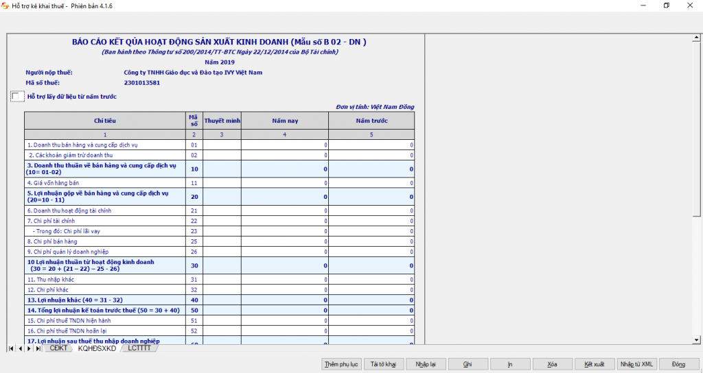 Sau khi nhập chỉ tiêu vào tất cả các báo cáo, nhập tên người lập biểu, kế toán trưởng, giám đốc và ngày ký. Sau đó bấm ghi để lưu bộ báo cáo và bấm xuất để xuất bộ báo cáo sang tệp Excel hoặc XML nếu được yêu cầu.